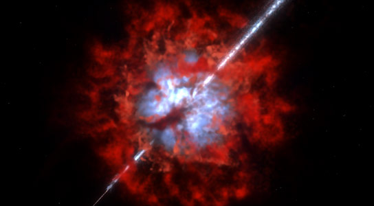 艺术家基于ALMA观测,GRB 020819B周围环境的概念。