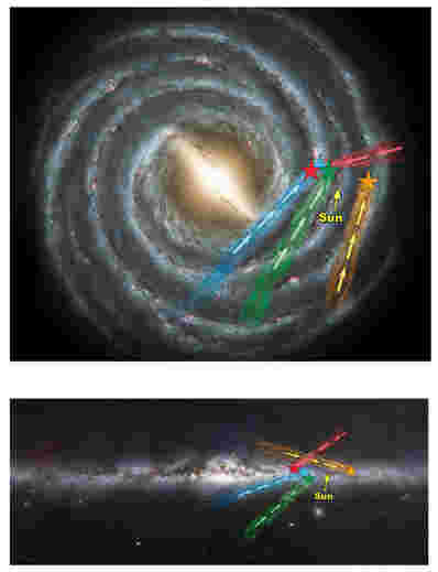 银河系的顶部和侧视图,展示了四个新的超细恒星的四个位置。这些是阳光状的恒星,它相对于银河系超过每小时超过一百万英里的速度:足够快,以逃避其引力掌握。彩色条带示出了星星的一般方向。Vanderbilt University的Julie Turner的图形设计。顶视图由美国国家航空航天局提供。侧视图由欧洲南部天文台提供。