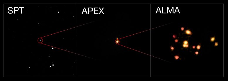 该剪辑画面显示了遥远的相互作用和合并星系组SPT2349-56的三个视图。左图是南极望远镜的宽视野,仅显示了一个亮点。中心视图来自阿塔卡马探路者实验(APEX),该实验揭示了更多细节。右图来自阿塔卡马大毫米/亚毫米阵列(ALMA),它揭示了在形成星系团的过程中,该物体实际上是由14个正在合并的星系组成的组。