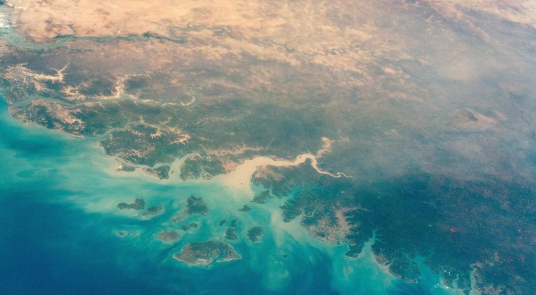 国际空间站(ISS)的宇航员乘坐这个倾斜照片,展示了几内亚比绍的大部分非洲国家,以及邻近的几内亚,冈比亚和塞内加尔,以及毛里塔尼亚的南部。这种场景从绿色森林植被和大西洋海岸的湿气候延伸到撒哈拉沙漠的几乎植被的景观。