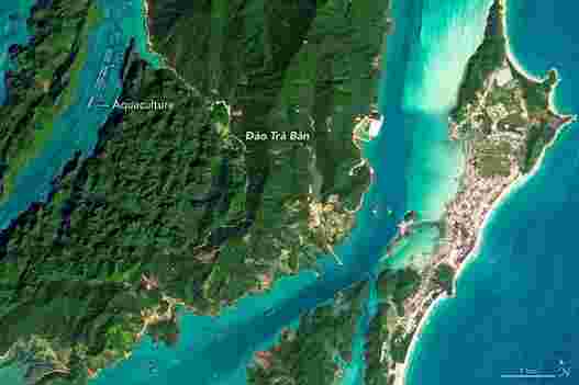 此页面顶部的图像显示了越南东北沿岸的两个海湾,大约170公里(100英里)以东河内以东。图像于2020年11月12日在Landsat 8上由运营陆地成像器(Oli)收购。