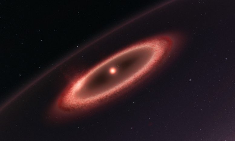 这位艺术家的印象展示了新发现最近明星的尘埃带,距太阳系,Proxima Centauri可能会看。