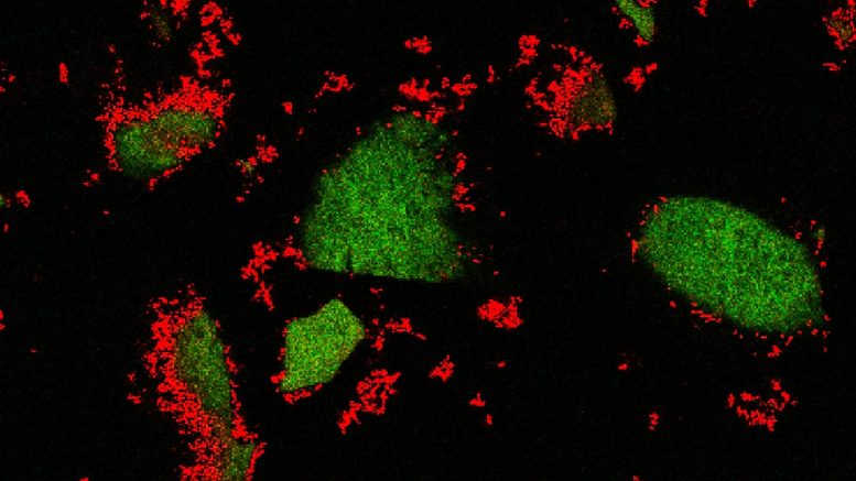 普林斯顿研究人员进行的芯片实验上的土壤模仿土壤,碳化合物和土壤细菌之间的相互作用,产生新的证据,即大碳分子可能会比以前思想更快地逃脱土壤。在这种显微镜图像中,土壤细菌(红色)在粘附在透明合成粘土中的葡萄糖(绿色)的聚集体周围生长。