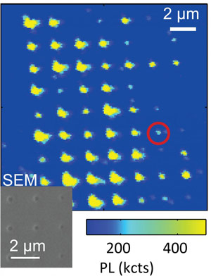 金刚石样品的表面共焦扫描显示黄色空位中心。单个NV中心以红色圈出。插入扫描电子显微镜图像显示单独样品中的孔,为微小凹坑。秤杆是米的两百万米。照片由awschalom集团
