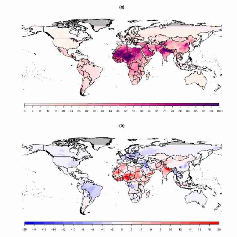 (a)2016年全球PM2.5地图; (b)2010年至2016年之间的集中度变化。两者的单位均为g μ/ m3。