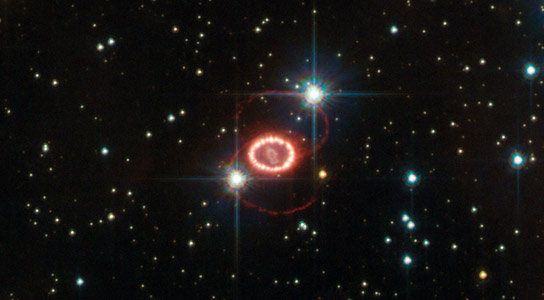 在这里,在NASA的哈勃太空望远镜拍摄的图像中显示了Supernova 1987a的仍然沉默的遗骸。明亮的环由在引爆之前从垂死的恒星喷射的材料组成。戒指被爆炸的冲击波亮起。