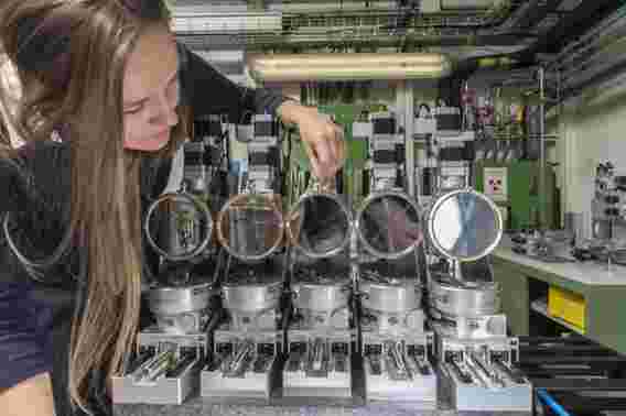 Kristina Kvashnina在ESRF进行实验时,位于ROBL-HZDR光束线光谱仪的前面。