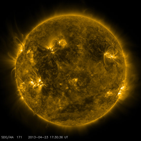 美国宇航局的太阳能动力学天文台捕获了太阳在2013年4月23日看起来像下午1:30的那种形象。 EDT当Eunis Mission推出时。Eunis专注于太阳的活跃区域,在这张照片中看到了右上角的明亮环。图像