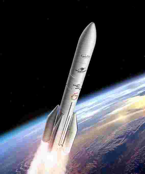 艺术家对使用四个增强器(A64)进行的Ariane 6配置的看法。