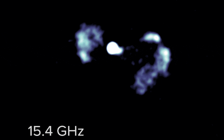 该图像是在观察频率的六个VLBA图像的复合频率,从2.2 Gigahertz(GHz)到22.2 GHz。明亮核心两侧的宽阔叶片是射流活动的结果,这些活动大约80年前开始。科学家们说,这些裂片与中央区域之间的差距表示,在此之后,喷射活动停止了,然后大约10年前恢复。
