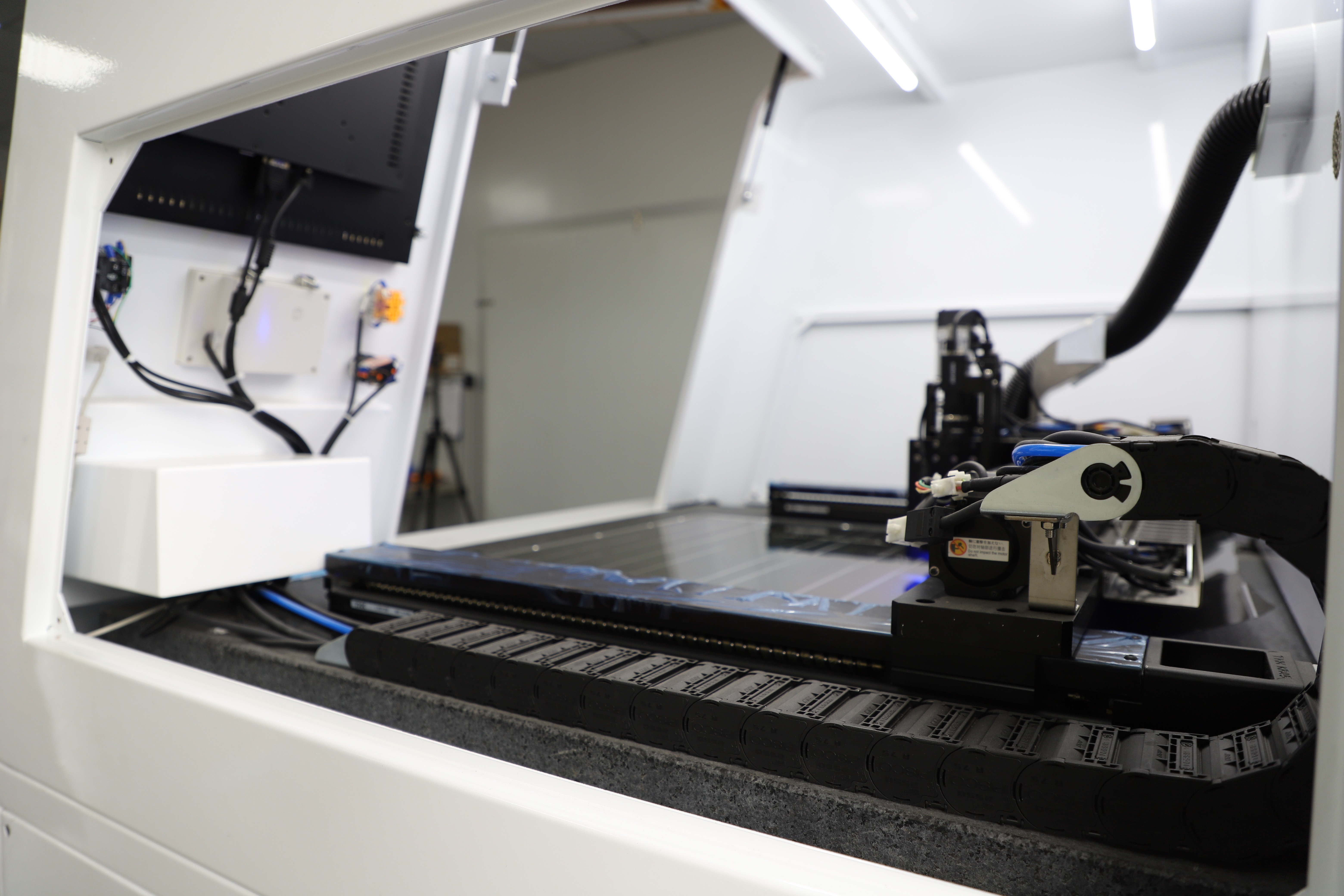 高精确激光修边机:采用"先贴膜后切割"工艺,利用CCD识别玻璃四边八线段特征,切割精度≤±0.075mm,支持内缩切割模式,解决车载异形屏贴膜后的边缘平整度及"双眼皮"视觉缺陷。