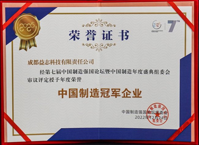 为深入贯彻党的二十大精神,推动中国制造由大变强,扎实推进工业强基、产业基础再造工程,助力制造企业走专业化、差异化高质量发展之路,2022年12月23日至24日,第七届中国制造强国论坛在河北保定隆重举行。本次论坛以“补短板·锻长板·固底板”为主题,汇聚了多位部委领导、两院院士、行业专家学者,以及20余家行业协会、上百家深耕制造业领域的企业负责人,共同探讨经济发展新格局及经济复苏新形势下,中国制造业企业的破局路径与发展方向。成都益志科技有限责任公司应邀出席本次论坛,并凭借在行业内的突出实力与优异贡献,荣获“中国制造冠军企业”称号。