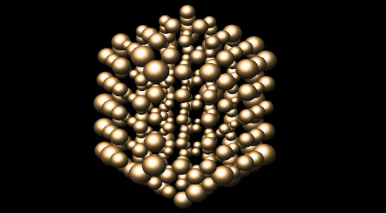 小原子簇中的原子振动程度的图示。球体代表原子的运动范围,而不是原子本身–球体的大小已放大了45倍,以便于可视化。表面上的原子的运动范围比团簇中间的原子大。