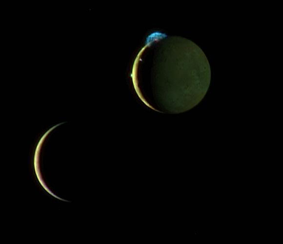 这是2007年3月2日的IO和Europa的综合图像,新的Horizone SpaceCraft。这里IO位于顶部,有三个火山羽毛可见。来自TVashtar Volcano的300公里(190英里)的高羽流量位于IO的盘上的11点钟位置,在IO磁盘边缘的9点钟位置,来自火山普罗米修斯的羽毛较小,沿着线垂景的一天和夜晚,他们之间的火山amirani。学分:NASA / jhu应用物理实验室/西南研究所
