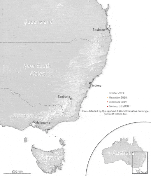 该动画显示了2019年10月至2020年1月之间的火灾次数如何增加。这些测量仅由Copernicus Sentinel-3A卫星在夜间进行,并且由于空间分辨率限制为1 km,因此该动画虽然令人震惊,但实际上低估了火警的次数。