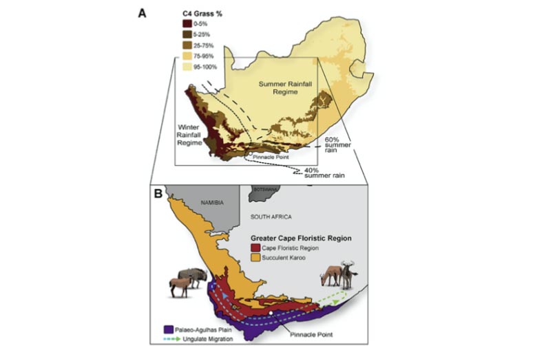 a)南非(SA)的地图显示与沿着海岸向西到西部的夏天雨中百分比相关的C4草的分布,西方冬季降雨区(从Vogel,1978年修改); b)SA的地图显示,展示大海普植物区的地区,随着扩大的罂粟和假设的动物迁移(即,假设动物在夏季降雨区和西海岸的东海岸之间进行长距离迁徙冬季降雨区)。