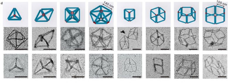 通过连接自连接的三角形M-DNA和矩形M-DNA构造的各种3D多面体的模型和透射电子显微镜(TEM)图像。从左到右:四面体,三角双锥,八面体,五角双锥,三角棱柱,矩形棱柱,五角和六棱柱。