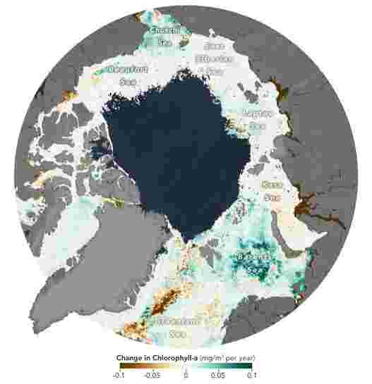 上图显示了在这种越来越无冰的环境中浮游植物的成功。它显示了在过去的二十年中,北冰洋的叶绿素a(浮游植物用来利用阳光来制造食物的色素)含量的变化。该地图是使用区域算法制作的,该算法结合了NASA的SeaWiFS和MODIS仪器的卫星数据。请注意,大部分增加是在楚科奇海域和巴伦支海中。