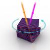 两块氮化硼晶体相对于彼此动态扭曲。由于微机械对称性的破坏,在某些角度下,入射的激光(橙色光束)可以有效地转换为更高能量的